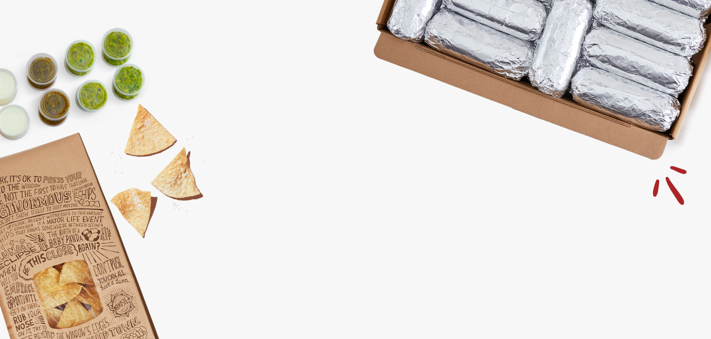 Mix and match your favourites with Burritos by the Box, or we’ll send you an assortment perfect for small get-togethers. Plus, every two burritos come with Chips, Tomatillo Green-Chili Salsa, and Sour Cream.